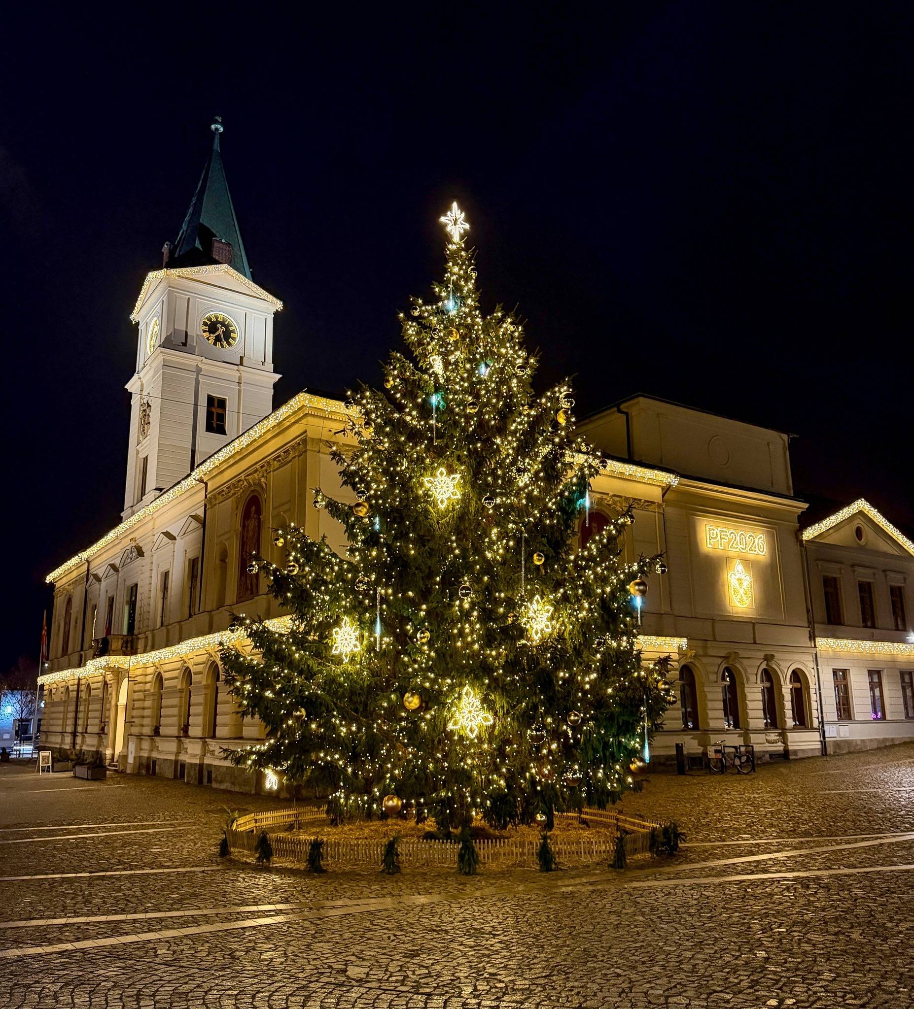 Vánoční strom a vyzdobená radnice s novou fasádou v roce 2017