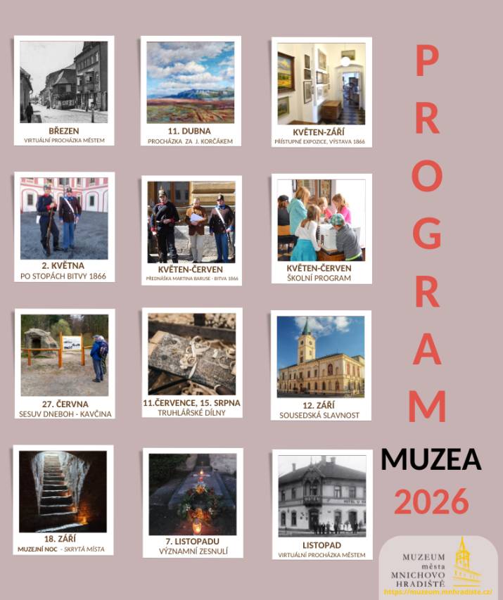 Muzeum Mnichovo Hradiště tak i v roce 2026 potvrzuje svou roli živého kulturního centra, které nabízí nejen poznání, ale i prostor pro setkávání a společné zážitky. Podrobné informace a aktuální termíny akcí budou k dispozici na webových stránkách www.muzeum.mnhradiste.cz a sociálních sítích muzea (Facebook, Instagram). Změna programu vyhrazena. Jednotlivé akce budeme průběžně aktualizovat a upřesňovat.
