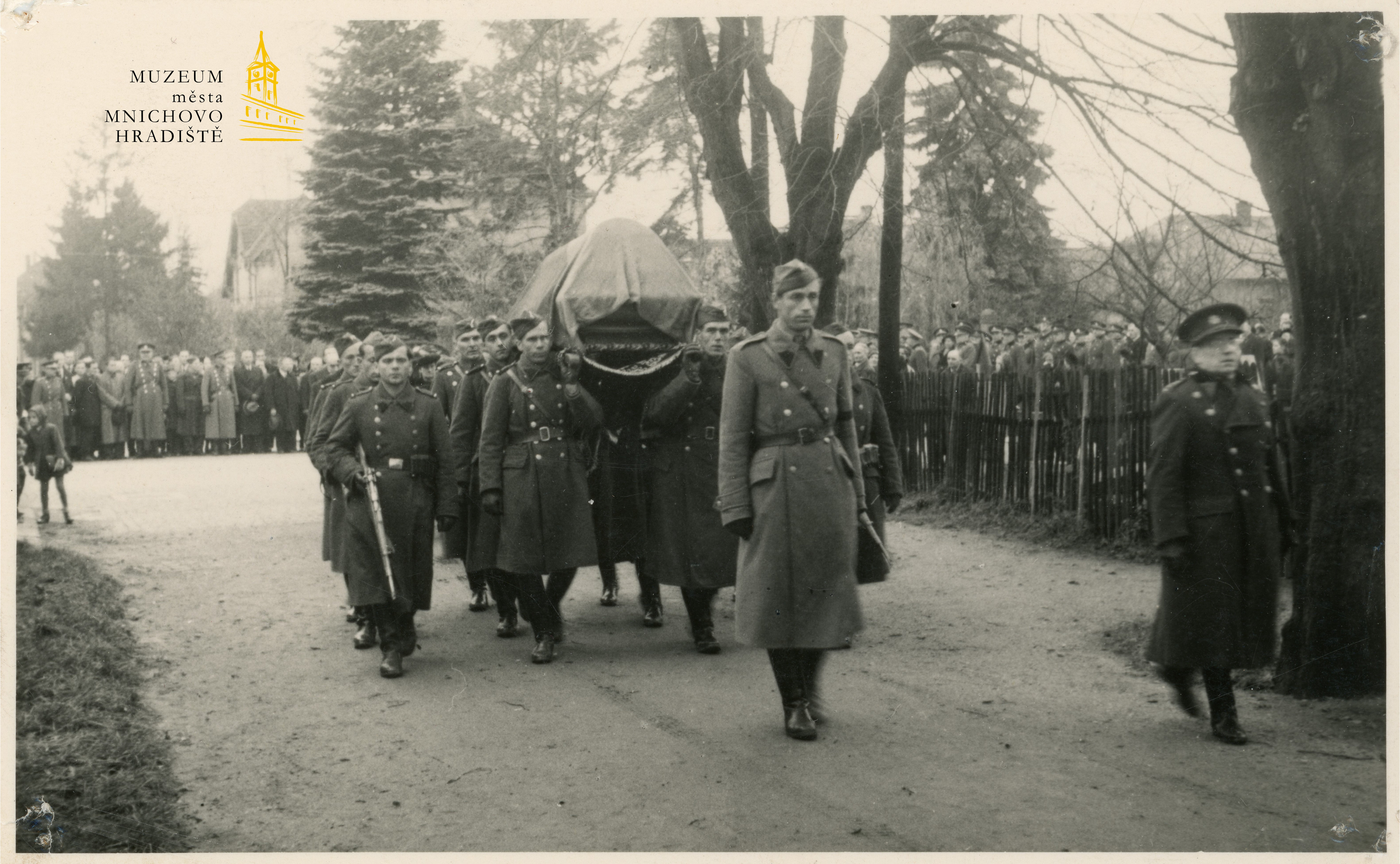 Státní vojenský pohřeb Jana Švermy v Mnichově Hradišti, průvod míří z ul. Jiráskova k hlavní bráně městského hřbitova, 11. 11. 1945 / p. č. 1053/2016/9, fotoarchiv Muzea města Mnichovo Hradiště