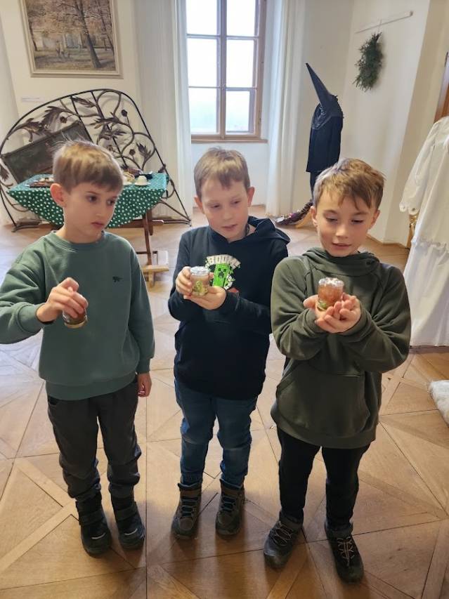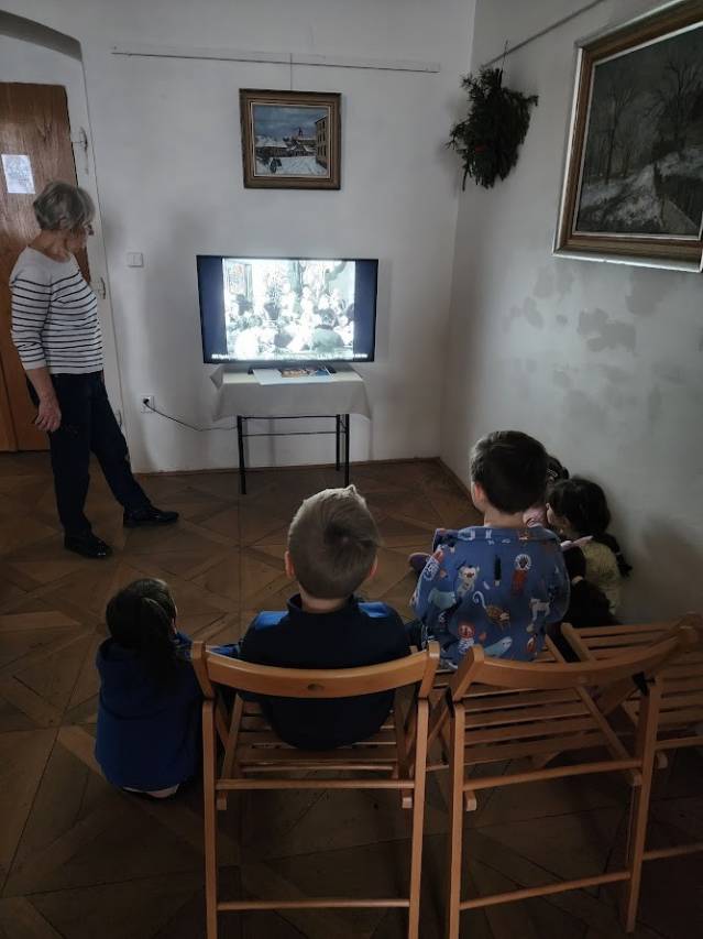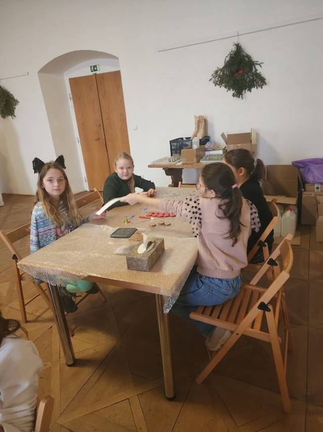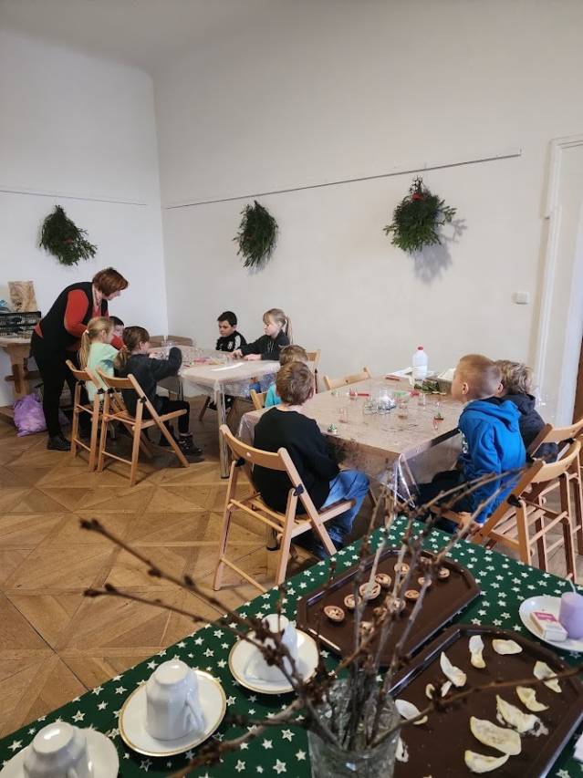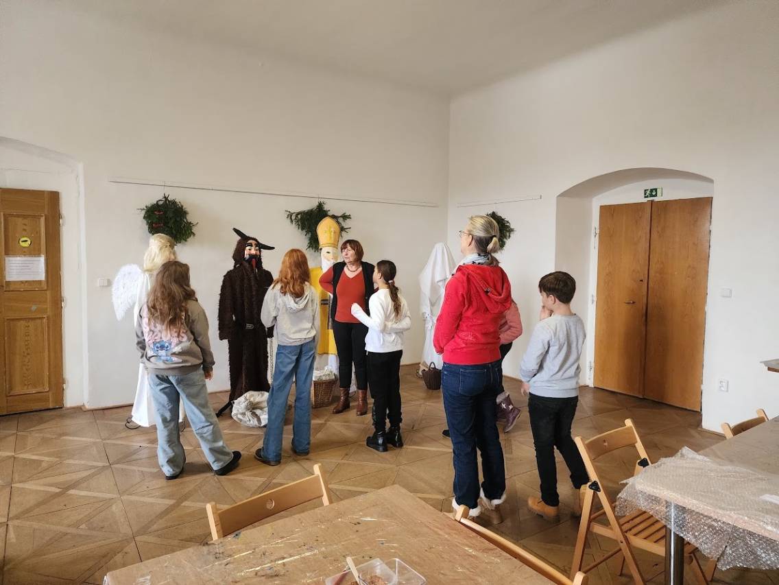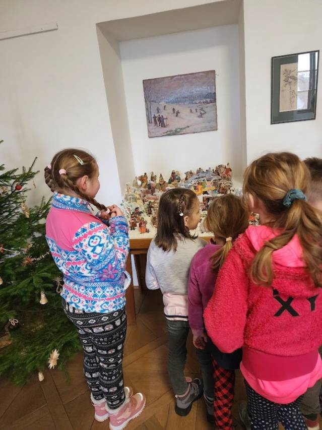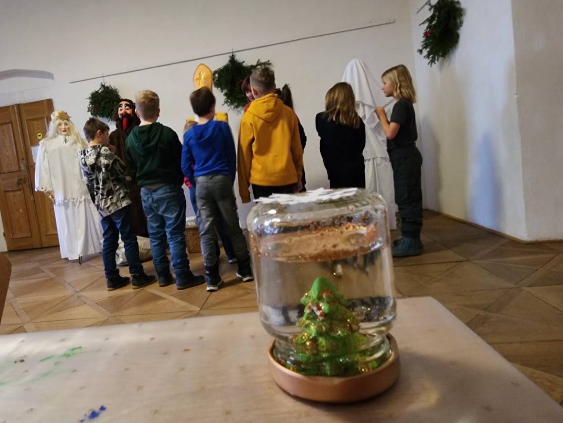Na tomto stanovišti jsme se věnovali vánočním zvykům a tradicím. U čaje a vánočky jsme si s dětmi povídali o tom, jak lidé zimní období prožívali dříve, děti se setkaly s hudbou Jiřího Ignáce Linky z Bakova nad Jizerou a někdy si společně i nacvičily koledu, prohlédly vystavené betlémy zhotovené různými technikami a nazdobený vánoční stromeček. Pro atmosféru jsme zapálili i voňavé františky. Tato klidná část programu byla u dětí oblíbená.