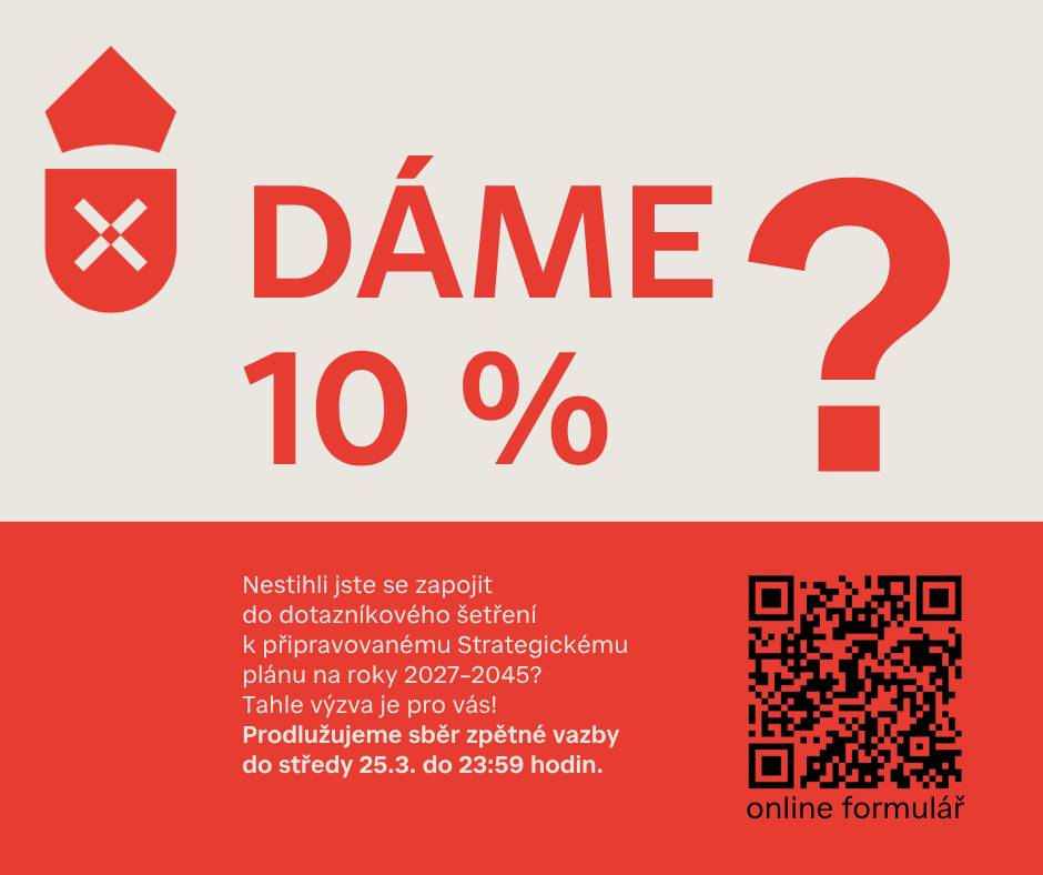 Lhůtu pro odevzdání vyplněných dotazníků jsme se rozhodli prodloužit do středeční půlnoci (25. března 2026). Pokud jste snad nestihli pondělní termín, nevěšte hlavu. Stále se můžete zapojit. Budeme za to rádi. Fyzicky můžete dotazníky odevzdat na podatelně městského úřadu, v infocentru a knihovně, elektronickou verzi dotazníku naleznete zde: https://1url.cz/deizw