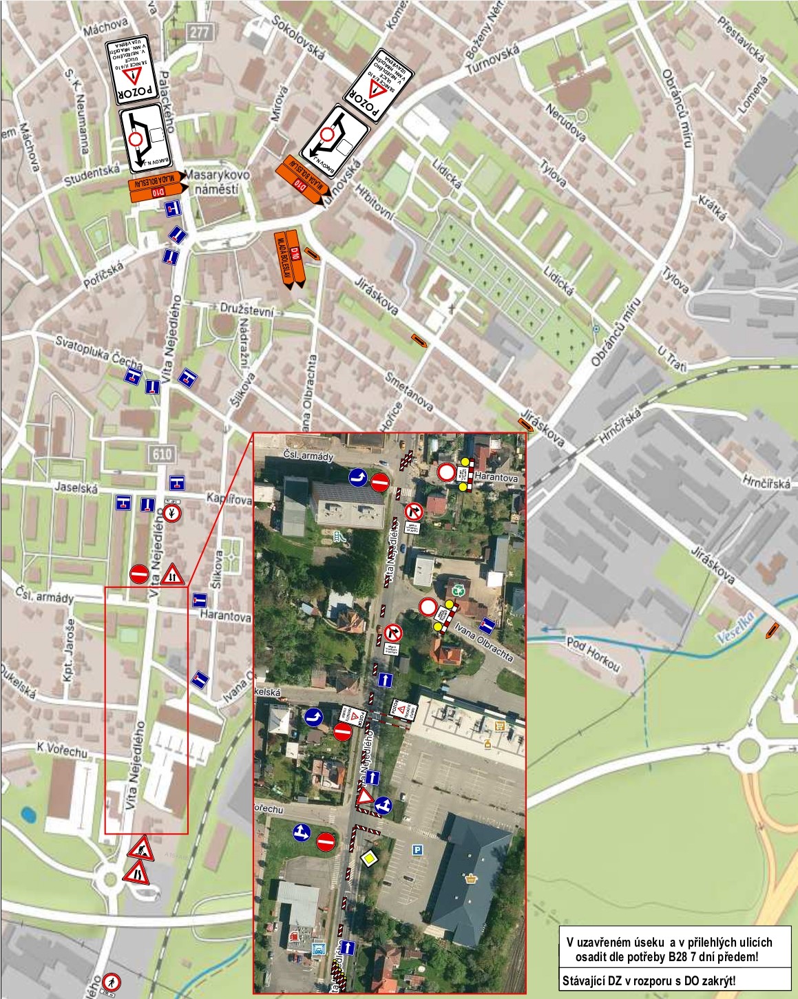 Od středy 15. října bude na nezbytně dlouhou dobu ulice Víta Nejedlého opět průjezdná jen jedním směrem, a to v úseku od čerpací stanice Orlen po křižovatku s ulicemi Harantova a Čsl. armády. Omezení mohou trvat až do 15. listopadu 2025. Během této doby bude úsek průjezdný dle potřeb stavby vždy jedním pruhem směrem na náměstí. Důvodem je oprava obrusné vrstvy asfaltu.