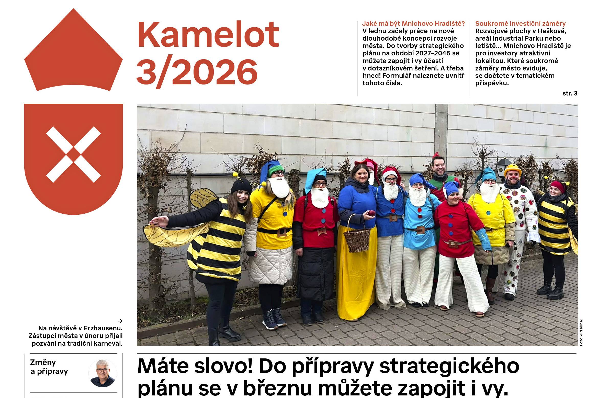 Ústředním tématem březnového Kamelotu je připravovaný strategický plán města na období 2027-2045. Hned na titulní straně se můžete dočíst o plánovaném procesu vzniku nového strategického dokumentu, o dotazníkovém šetření nebo prvním veřejným setkáním nad strategickým plánem. Starosta města ve svém sloupku zve k vyplnění dotazníku, který je součástí vydání a který lze vyplnit jak papírově, tak elektronicky na https://1url.cz/xe1fv