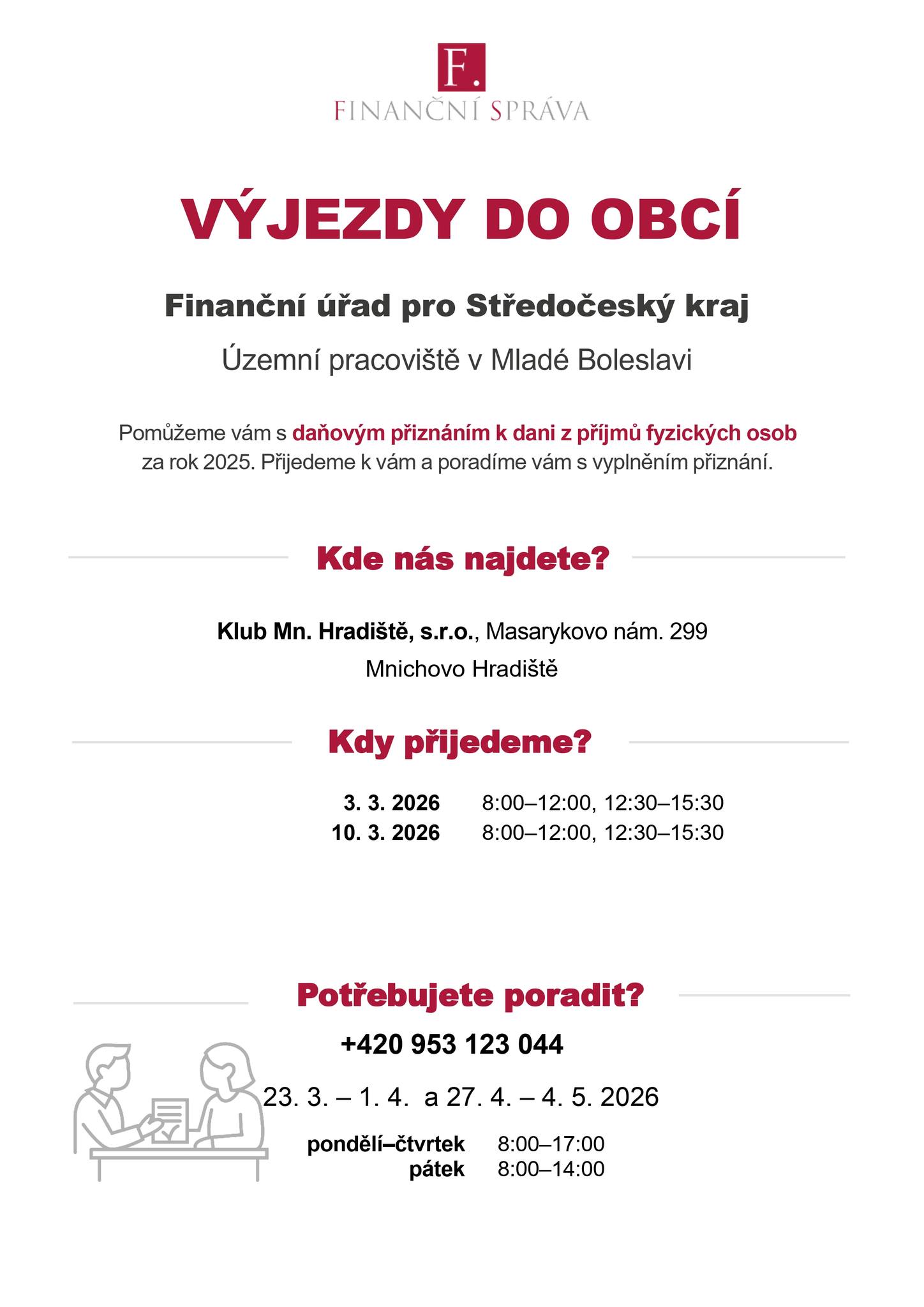 Zatímco daň z nemovitosti už máme za sebou, většiny z nás se aktuálně týká daň z příjmu fyzických osob. Pokud nám daňové přiznání nezpracovává poradce, máme povinnost podat daňové přiznání do 1. dubna v papírové podobě, na elektronické podání je čas do 4. května. Protože s vyplněním dokumentu si každý poradit nedovede, jsou finanční úřady připravené poskytovat individuální konzultace, a to jak přímo na úřadech, tak na telefonické infolince (více na plakátu níže). Finanční správa zároveň organizuje výjezdy úředníků do míst, kde v posledních letech došlo ke zrušení poboček finančních úřadů. To je případ i Mnichova Hradiště.