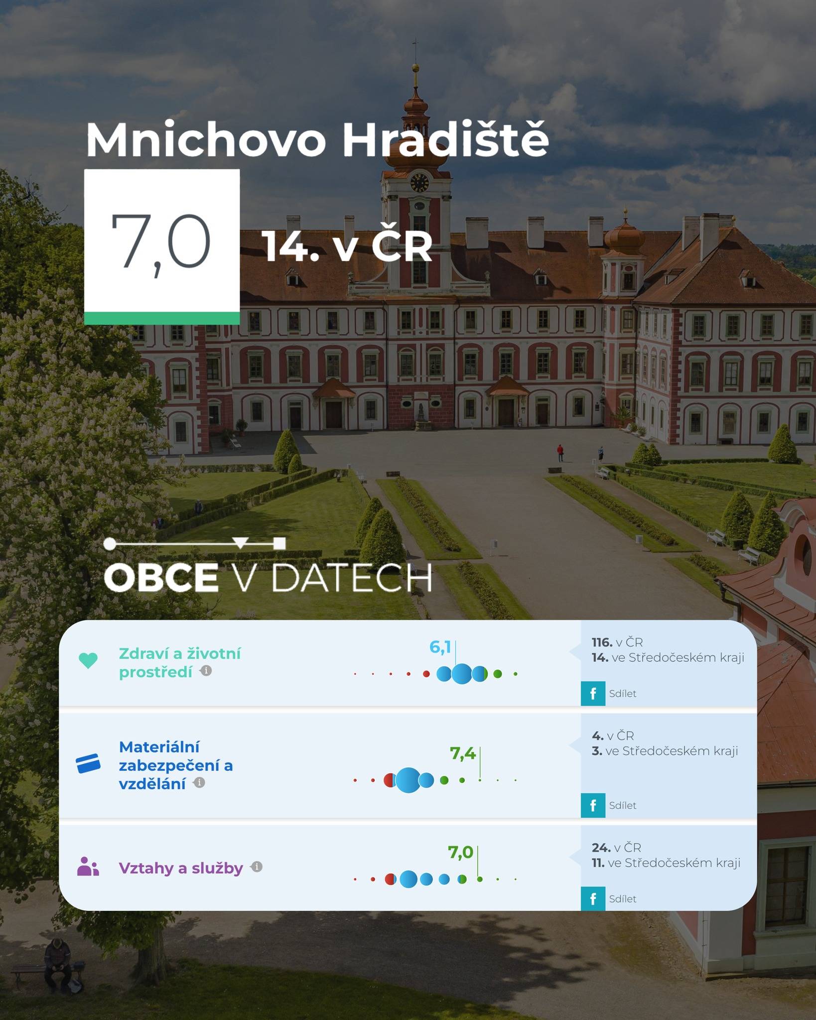 Kladné body sbíralo Mnichovo Hradiště zejména díky ekonomické prosperitě širšího regionu (Mladá Boleslav a Turnov se umístily na sdíleném 21.-40. místě), kvalitě vzdělání, společenského života a díky široké nabídce služeb. Vysoko hodnoceno bylo konkrétně za kvalitu středoškolského vzdělání, za nabídku pracovních příležitostí nebo za to, že je vyhledávané mladými ve věku 20-34 let, kteří tu chtějí žít. Absolutního prvenství dosáhlo v indexu hazardu, který byl před lety zcela zakázán - dnes ve městě nefunguje žádná herna.