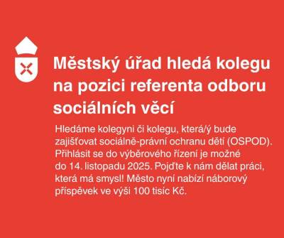 Městský úřad Mnichovo Hradiště opět vyhlásil výběrové řízení na obsazení pozice referent/ka sociálních věcí Odboru sociálních věcí a zdravotnictví. Náplní pracovní pozice je zajišťování sociálně-právní ochrany dětí. Jedná se tak o práci, která může zásadně pozitivně ovlivňovat životy dětí.