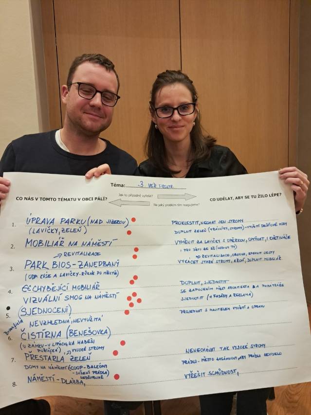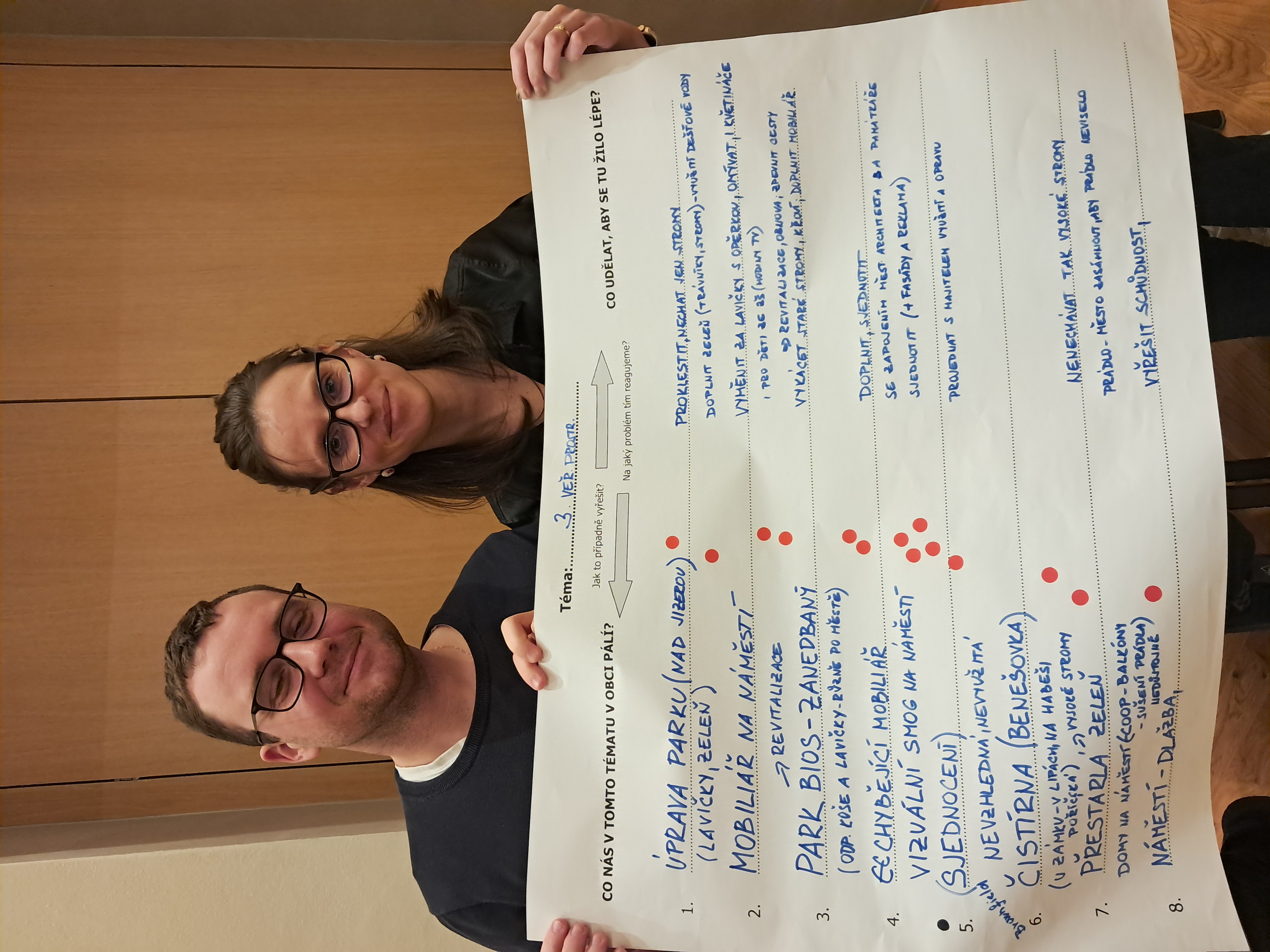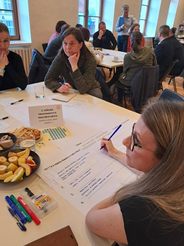 Účastníci se následně podle svého zájmu rozdělili do menších skupin a u tematicky zaměřených stolů společně identifikovali problémy a hledali návrhy řešení ve vybraných oblastech života. Konkrétně se zabývali například oblastí veřejných služeb (školy a školky, sociální služby, zdravotnictví), komerčními službami (drobné podnikání, restaurace, ostatní služby), kvalitou veřejných prostranství (zeleň, místa pro setkávání, zanedbaná zákoutí), bezpečností, volným časem nebo dopravou a mobilitou. A jakých konkrétních priorit se diskutující dobrali? Vybíráme témata, která u jednotlivých stolů nejvíce rezonovala: