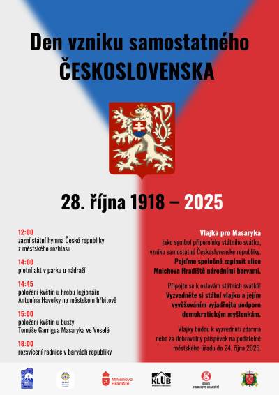 Od momentu, kdy byl vyhlášen samostatný stát Čechů a Slováků, uplyne 28. října 107 let. Ke sváteční atmosféře přispěje státní hymna, kterou bude hrát městský rozhlas i večerní nasvícení radnice v národních barvách. Zúčastnit se samozřejmě můžete také pietních aktů v parku u nádraží nebo ve Veselé.