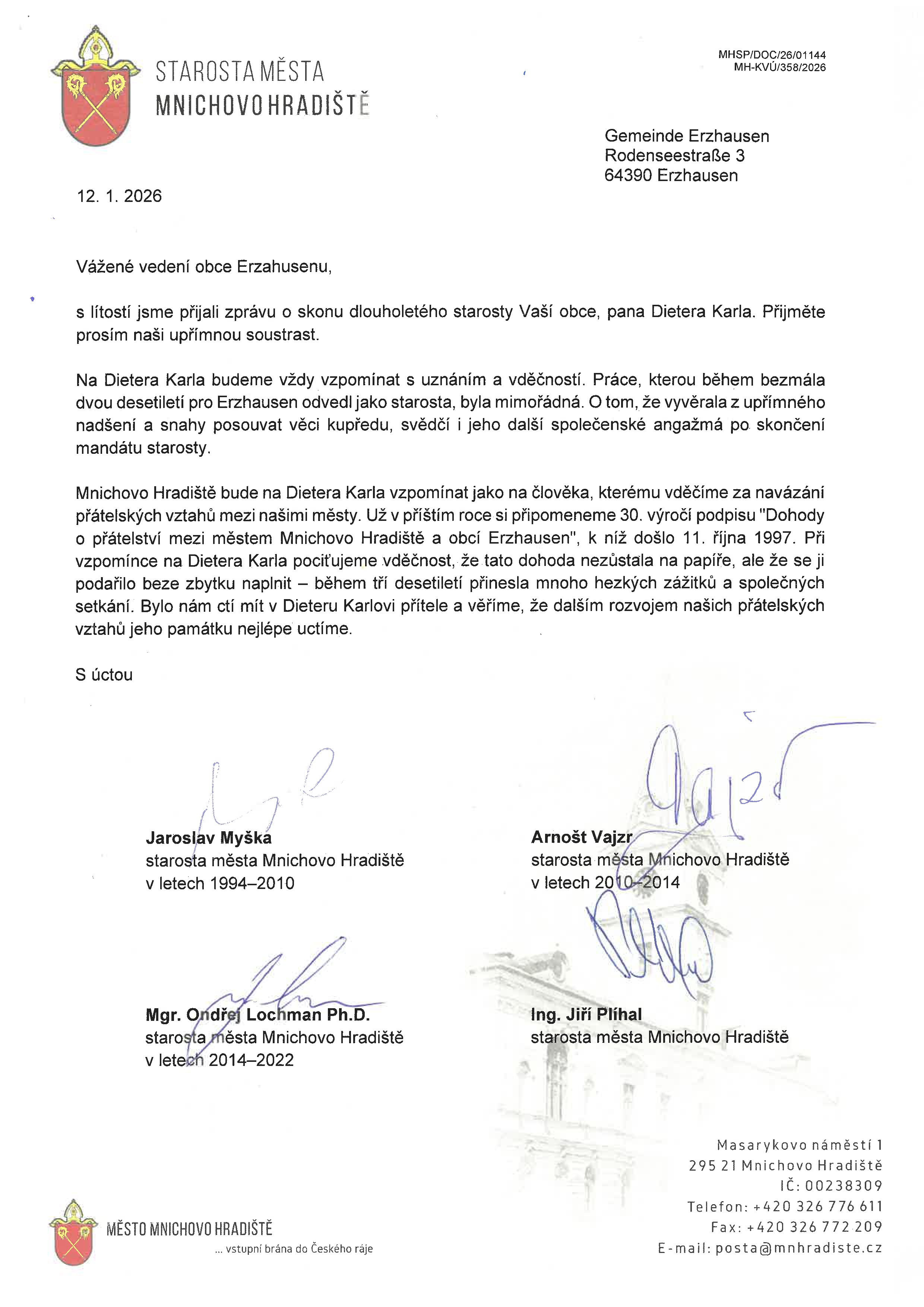 Na konci minulého týdne jsme přijali smutnou zprávu o skonu Dietera Karla, bývalého starosty našeho partnerského města Erzhausenu, který zesnul 31. prosince 2025. Dieter Karl stál v čele Erzhausenu bezmála 20 let a byl tím, kdo společně s mnichovohradišťským starostou Jaroslavem Myškou v roce 1997 podepisoval dohodu o přátelství mezi oběma městy. Ta byla východiskem dnes již bezmála třicetileté spolupráce.