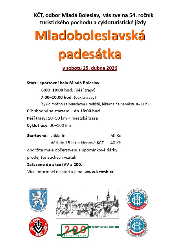Mladoboleslavský odbor Klubu českých turistů zve v sobotu 25. dubna 2026 všechny zájemce z řad příznivců pěších i cyklistických výletů na 54. ročník Mladoboleslavské padesátky. Tato tradiční jarní turistická akce nabízí řadu různých tras pro chodce i milovníky jízdy na kole s možností startu buď v Mladé Boleslavi, nebo nově i v Mnichově Hradišti u lékárny na náměstí, a to v čase od 8 do 11 hodin.