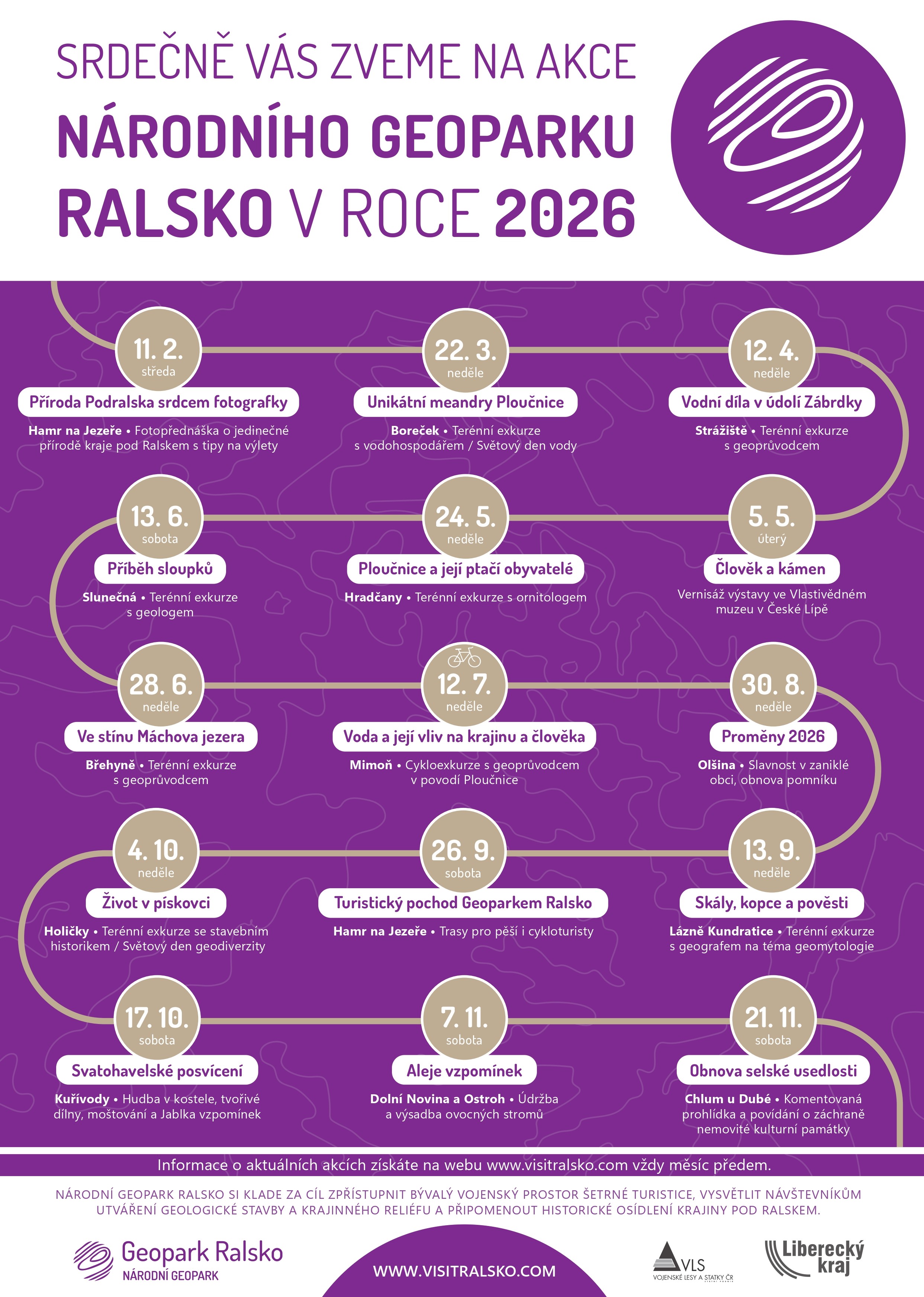 Program Geoparku Ralsko pro rok 2026 bude opravdu pestrý – nabídne terénní exkurze s odborníky (geoprůvodci, geology, ornitology či vodohospodáři), tematické vycházky i akce propojující přírodu s historií a kulturní pamětí území. Návštěvníci se mohou těšit například na poznávání unikátních meandrů Ploučnice, výpravy za přírodními fenomény i akcemi, které oživují příběhy krajiny a přibližují její proměny. Chybět nebudou ani tradiční akce, například Turistický pochod Geoparkem Ralsko, Svatohavelské slavnosti nebo péče o Aleje vzpomínek.