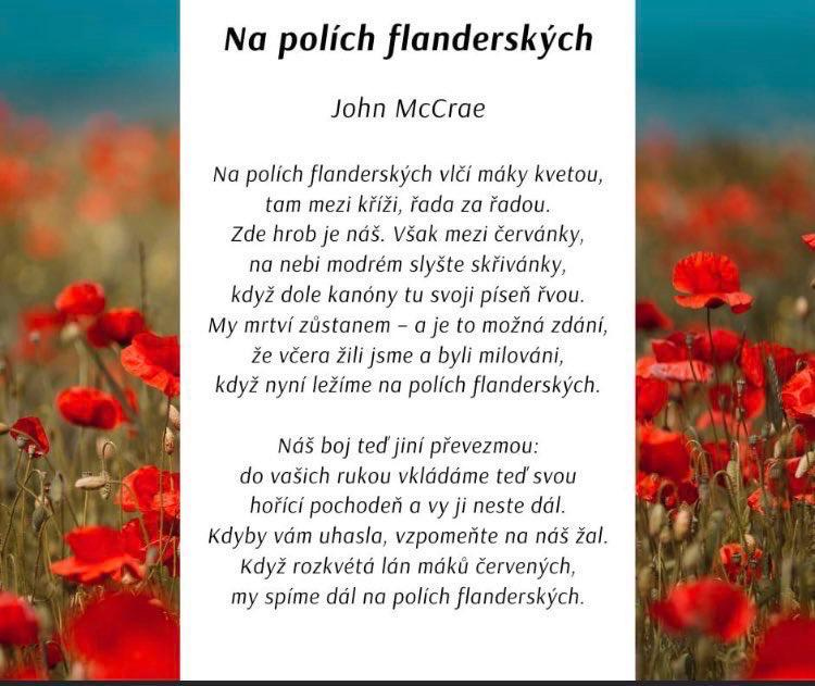 A proč právě vlčí mák jako symbol válečných veteránů? Výrazné rudé květy často pokrývaly pole, na kterých se na západní frontě 1. světové války sváděly těžké boje. Padlí vojáci mezi rudými květy mnohdy rovněž nacházeli místo svého posledního odpočinku. Vlčí mák byl jako symbol všech, kteří krváceli a nasazovali životy za svou zem, zvolen na základě působivé básně Johna McCrae, kanadského vojenského lékaře, která se dočkala rovněž zhudebnění. Přehrát si ji můžete i v českém přebásnění, níže připojujeme překlad samotné básně, jejíž autor se bohužel konce prvního světového válečného konfliktu nedožil...