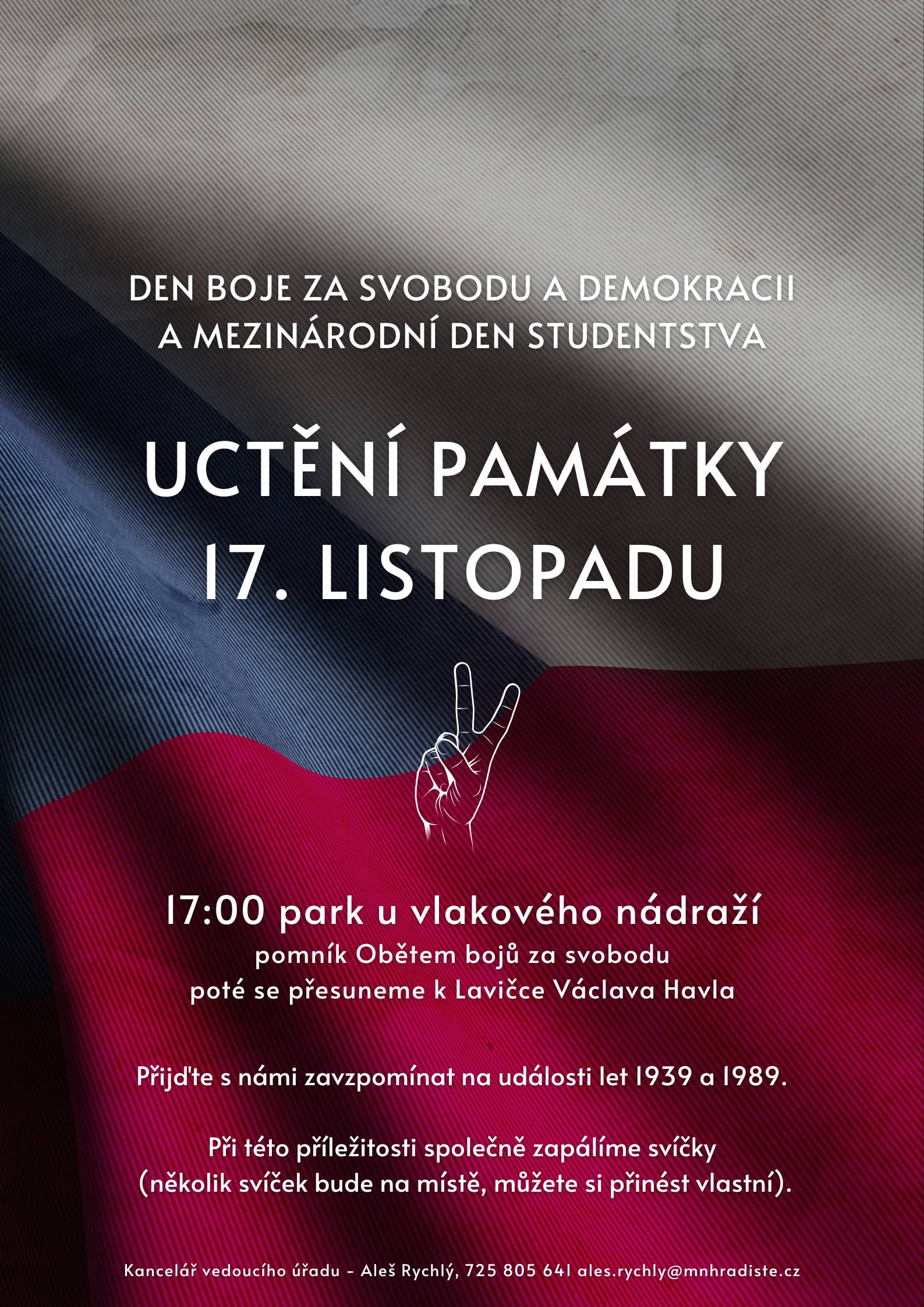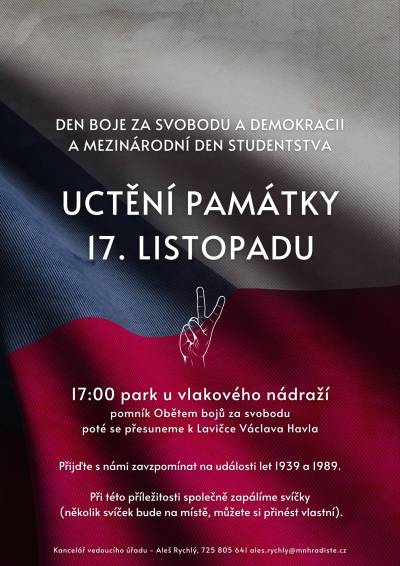 Na uzavření českých vysokých škol nacisty v roce 1939 i na sametovou revoluci roku 1989 zavzpomínáme v pondělí 17. listopadu 2025 na tradičních místech v parku u nádraží. Připojte se k nám!
