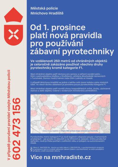 A aby svátky mohly být nejen kouzelné, ale také pohodové, připomínáme nová pravidla pro používání pyrotechniky. Vše najdete v přehledné grafice, která uvádí i informace o regulacích na veřejných prostranstvích i o omezení prodeje. V případě porušení pravidel se obracejte na Městskou policii Mnichovo Hradiště na čísle 602 473 156.