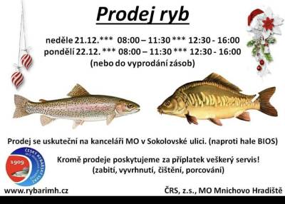 Vánoční prodej ryb se uskuteční v kanceláři MO Mnichovo Hradiště v Sokolovské ulici (naproti hale BIOS) v neděli 21. a pondělí 22. prosince v časech 8:00 - 11:30, 12:30 - 16:00 nebo do vyprodání zásob.