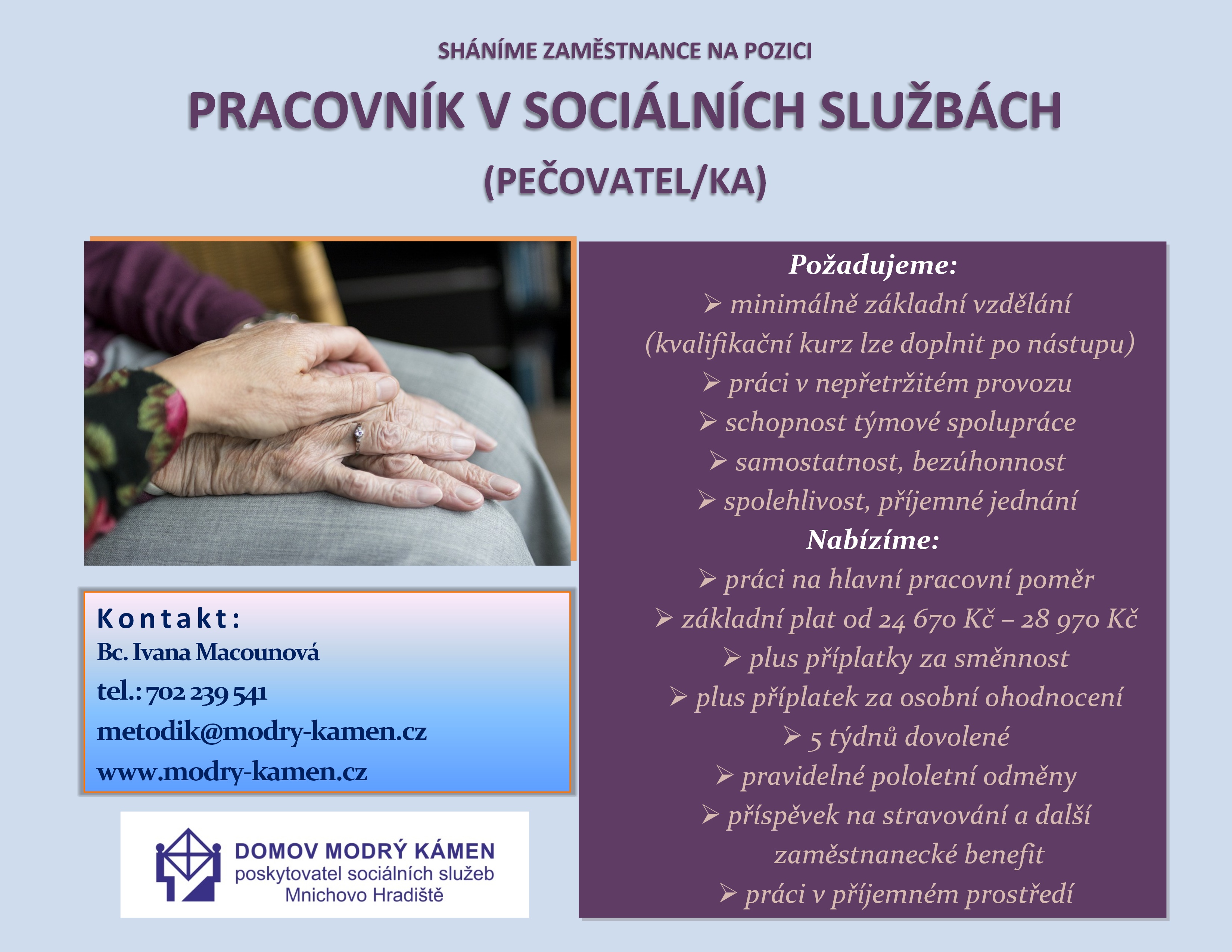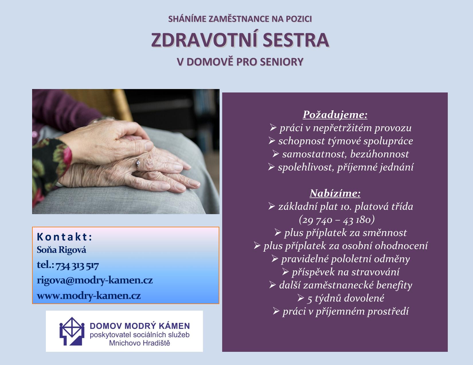 Domov Modrý kámen hledá do domova pro seniory zdravotní sestru (10. platová třída, plat 29.740– 43.180 Kč plus příplatky a pololetní odměny). Zájemci se mohou hlásit u Soni Rigové na tel. 734 313 517. Volná je rovněž pozice pracovníka v sociálních službách – pečovatel či pečovatelka (základní plat 24.670– 28.970 Kč plus příplatky a pololetní odměny). Zájemci o tuto pozici se mohou ozvat Ivaně Macounové na tel. 702 239 541. Další podrobnosti níže.