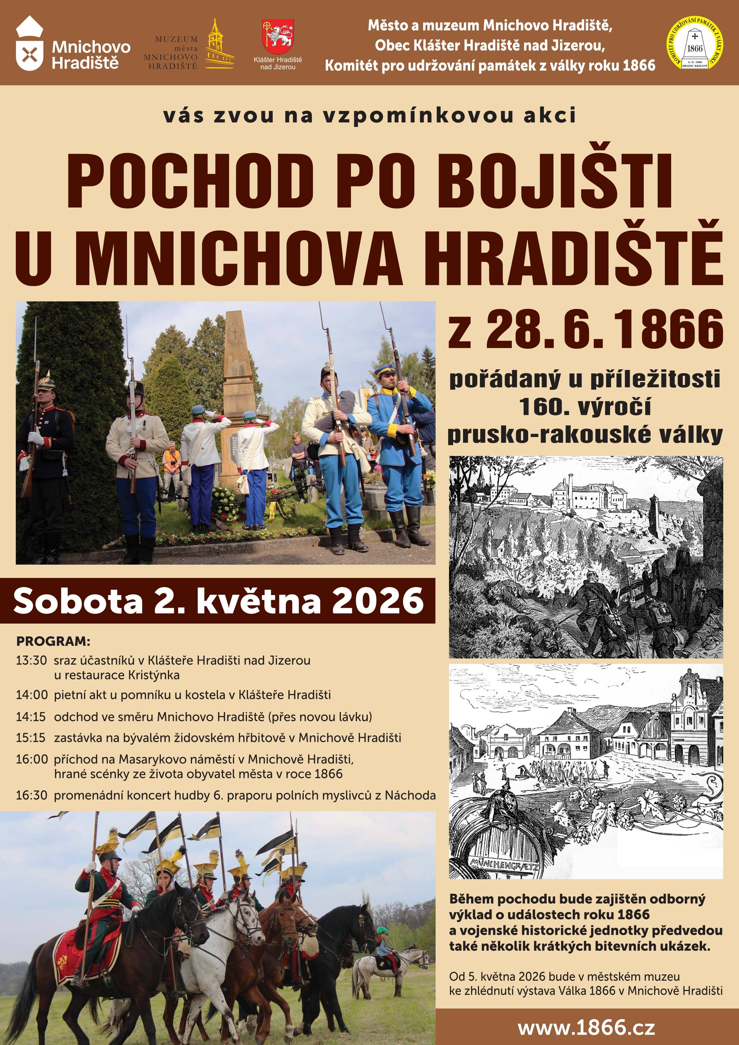 Už nadcházející sobotu 2. května 2026 se uskuteční v Mnichově Hradišti a na Klášteře historický vojenský pochod k 160. výročí prusko-rakouské války a bitvy u Mnichova Hradiště, během níž se ve zdejším kraji střetla vojska Pruska a Rakouska.