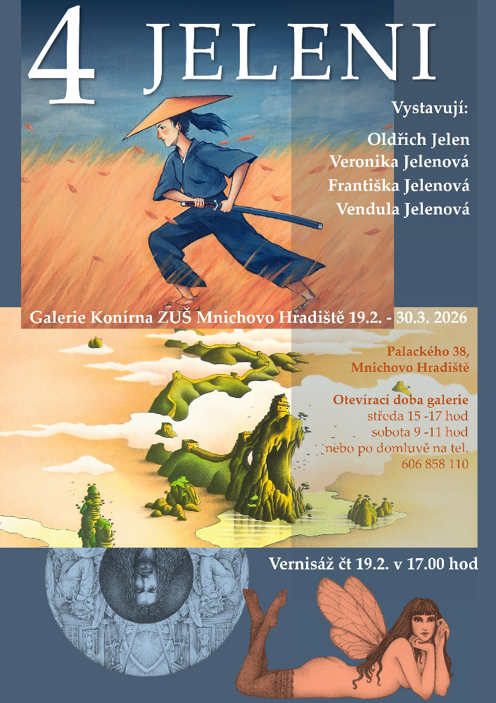 Výstava však nese název 4 Jeleni. Vedle Oldřicha a Veroniky Jelenových se totiž představí rovněž jejich dvě dcery Františka (nar. 1999) a Vendula (nar. 2004). Ty jdou ve stopách svých rodičů, výrazně je však inspiruje svět fantasy.
