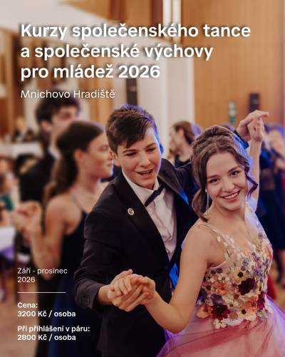 Od května spouštíme zápis do tanečních kurzů pro mládež ročník 2026! Letos nově nabízíme akční cenu pro páry! Očekáváme opět velký zájem, proto s přihlášením neotálejte Přihlášku najdete zde.