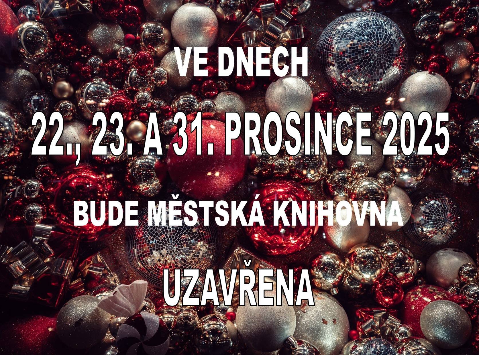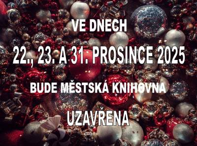 ve dnech 22.,23. a 31. prosince bude městská knihovna uzavřena. Knížky si tak budete moci půjčovat až do čtvrtka 18. prosince a následně v pondělí 29. a v úterý 30. prosince.