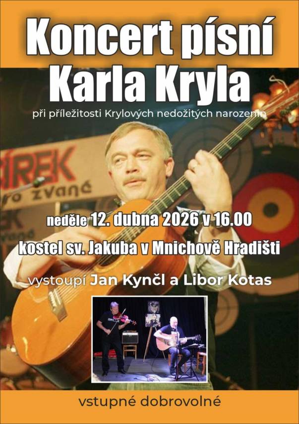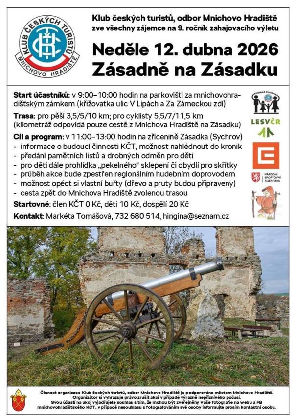 NEDĚLE - Za probouzející se jarní přírodou mohou zájemci vyrazit s Klubem českých turistů - Mnichovo Hradiště, který zve již podeváté na tradiční výlet Zásadně na Zásadku. Na romantické zřícenině bude možné opékat buřty nebo si zazpívat s kapelou. A zpívat se bude odpoledne také v kostele sv. Jakuba, který hostí koncert písní Karla Kryla v podání Jana Kynčla a Libora Kotase. Program začíná v 16 hodin.