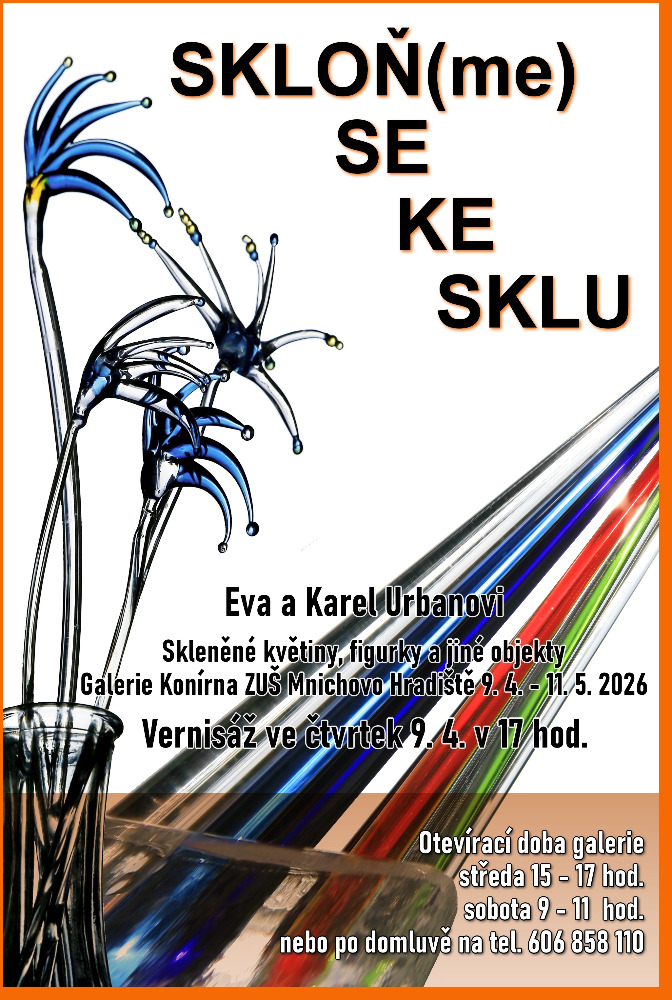 Po mnoha letech, kdy jste mohli manžele Urbanovy vídat předvádět jejich sklářskou práci na zámeckých vánočních akcích, se můžete opět setkat s jejich tvorbou, tentokrát v Galerii Konírna ZUŠ. A určitě dojde za ta léta na porovnávání, jak moc se oni, ale i jejich sklo změnili.