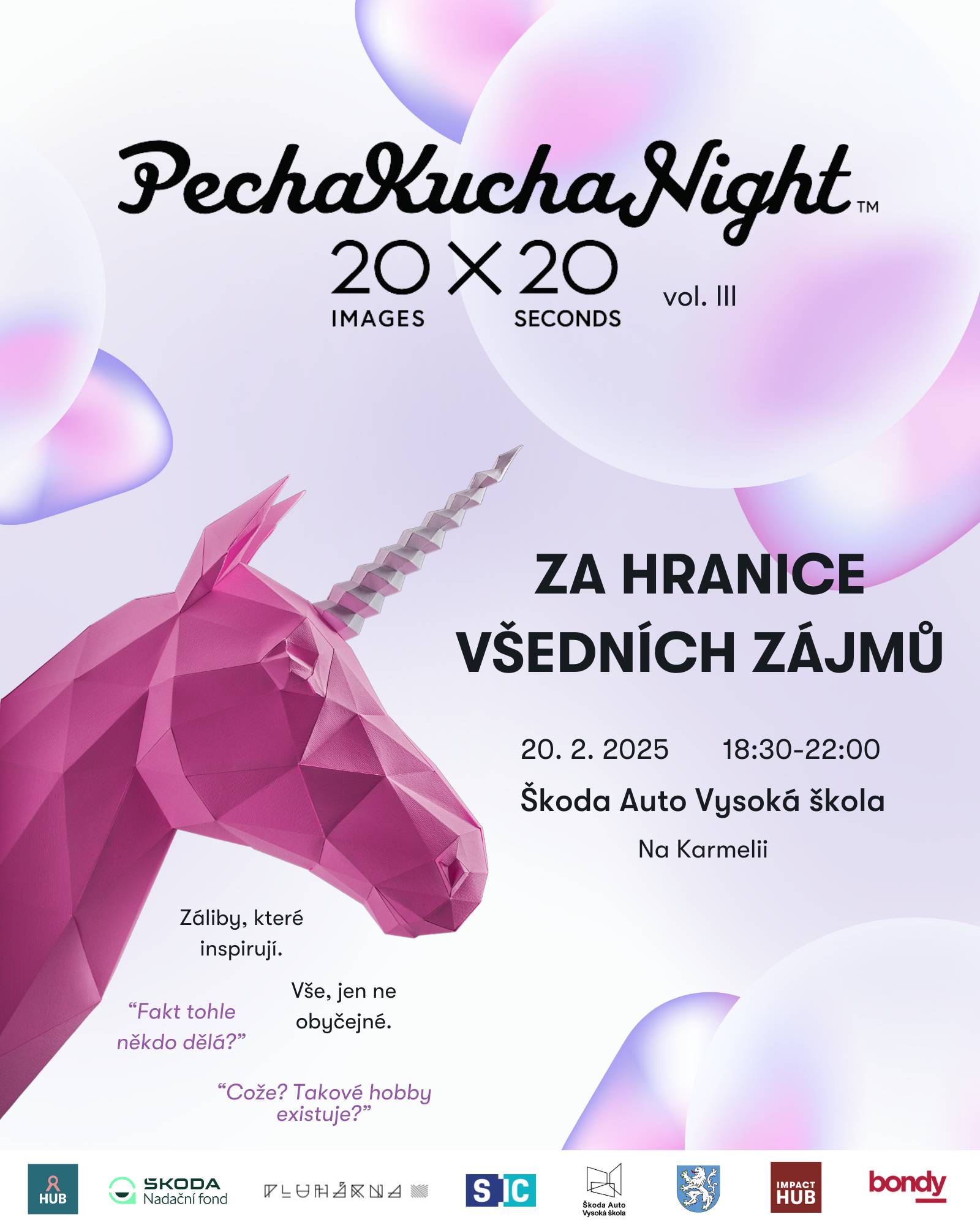 PechaKucha Night je globální fenomén, který přináší formát rychlých, dynamických prezentací. Každý řečník má k dispozici 20 obrázků, každý po dobu 20 sekund. Krátké a úderné prezentace, které vás inspirují, rozesmějí a možná i dojmou – a to vše během několika minut! Žádná zdlouhavá mluvení, jen čistá esence příběhu a vášeň pro téma. Třetí edice PKN nese název „Za hranice všedních zájmů“.