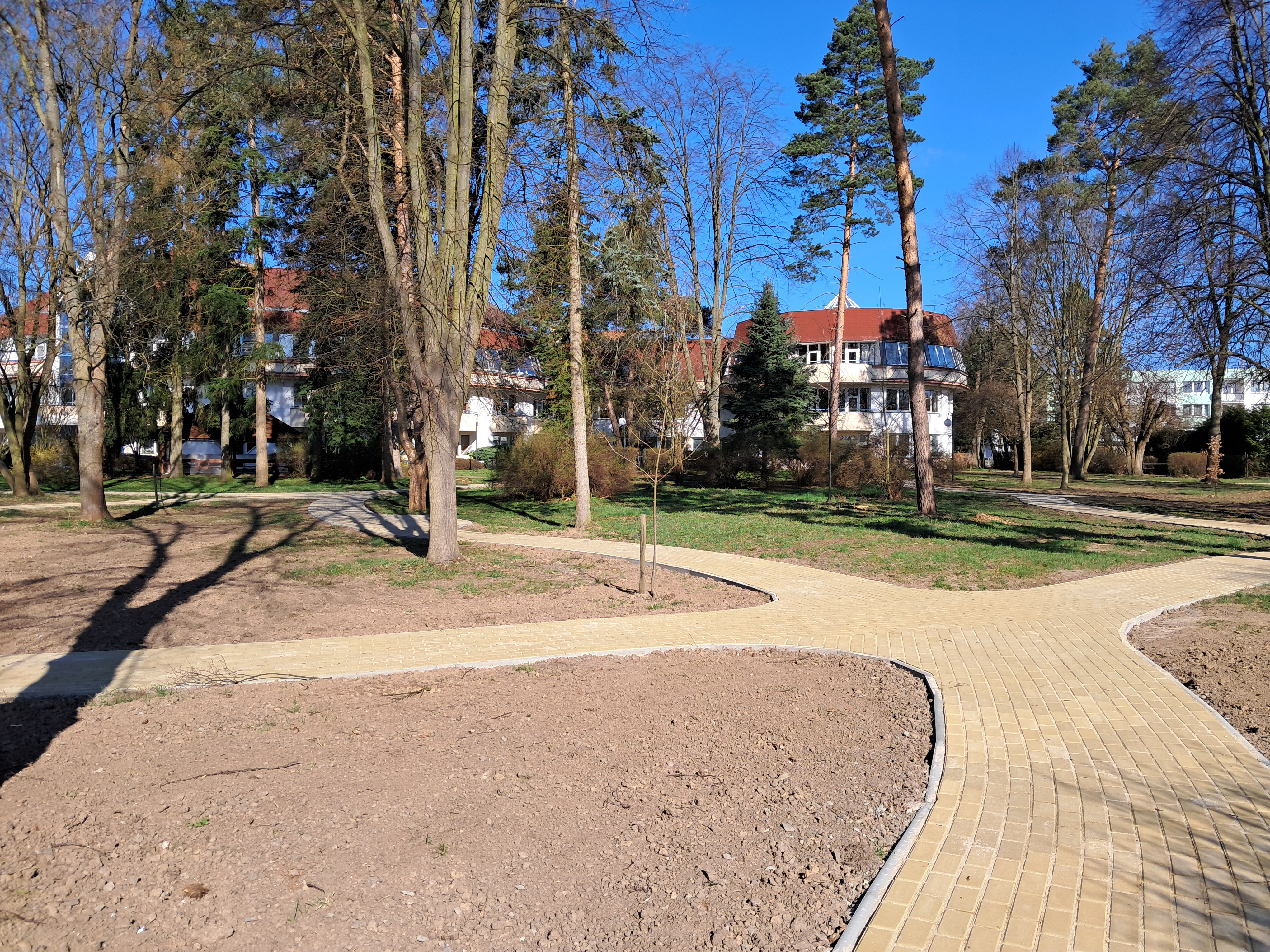 Dosud byly vybudovány nové dlážděné cesty, na nichž od listopadu do března pracovala společnost Developa. Ty mají perfektně rovný povrch, klikatí se pod vzrostlými stromy a co pár metrů jsou na nich připravená místa pro lavičky. Vznikly rovněž mlatové cesty včetně té, která spojuje park se zahradou odděleného pracoviště ZŠ Švermova, což park zpřístupňuje většímu počtu uživatelů a zároveň usnadňuje pohyb v lokalitě.