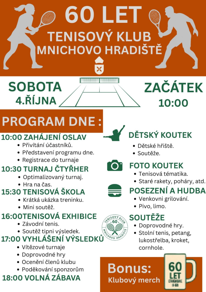 Pozvání na oslavy tenisového klubu, které se odehrají v sobotu 4. října, platí pro všechny, nejen pro členy mnichovohradišťské tenisové komunity. Přijďte se podívat na zápasy, exhibici, zasoutěžit si nebo posedět u grilu. Jste srdečně zváni.
