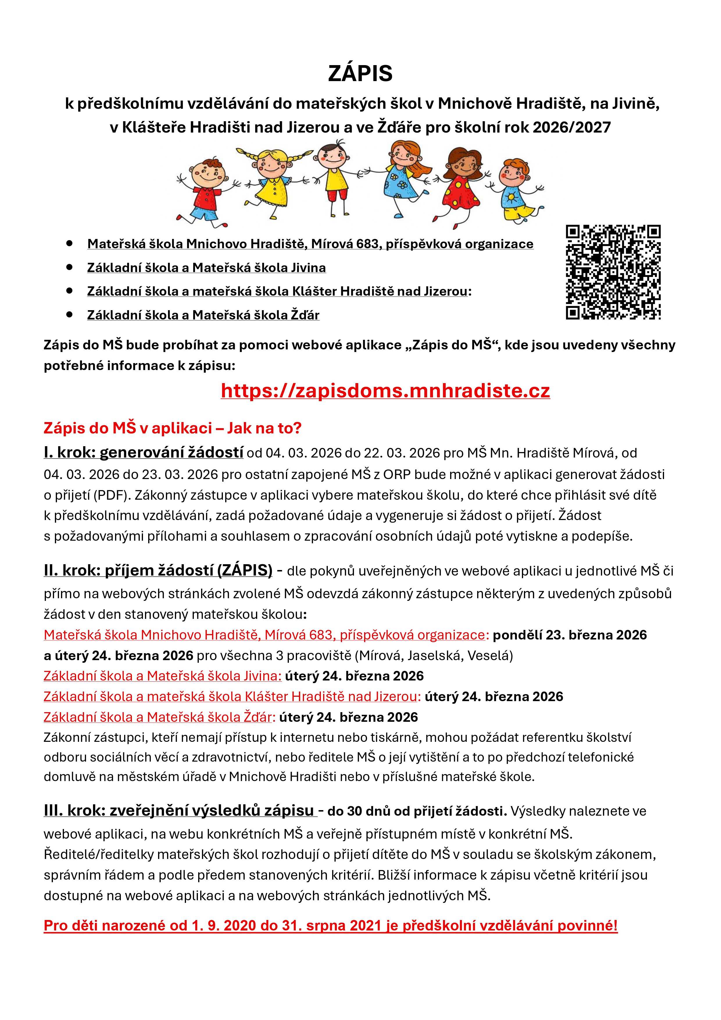 Máte zájem o zapsání vašeho dítěte do mateřské školy? Letos probíhají zápisy poprvé pomocí aplikace Zápis do MŠ. Jejím prostřednictvím můžete podat mezi 4. a 22. březnem žádost o přijetí do MŠ Mnichovo Hradiště, MŠ Jivina, MŠ Klášter Hradiště nad Jizerou a MŠ Žďár. Konkrétní termíny zápisů a rovněž proklik do aplikace naleznete na webech jednotlivých škol.