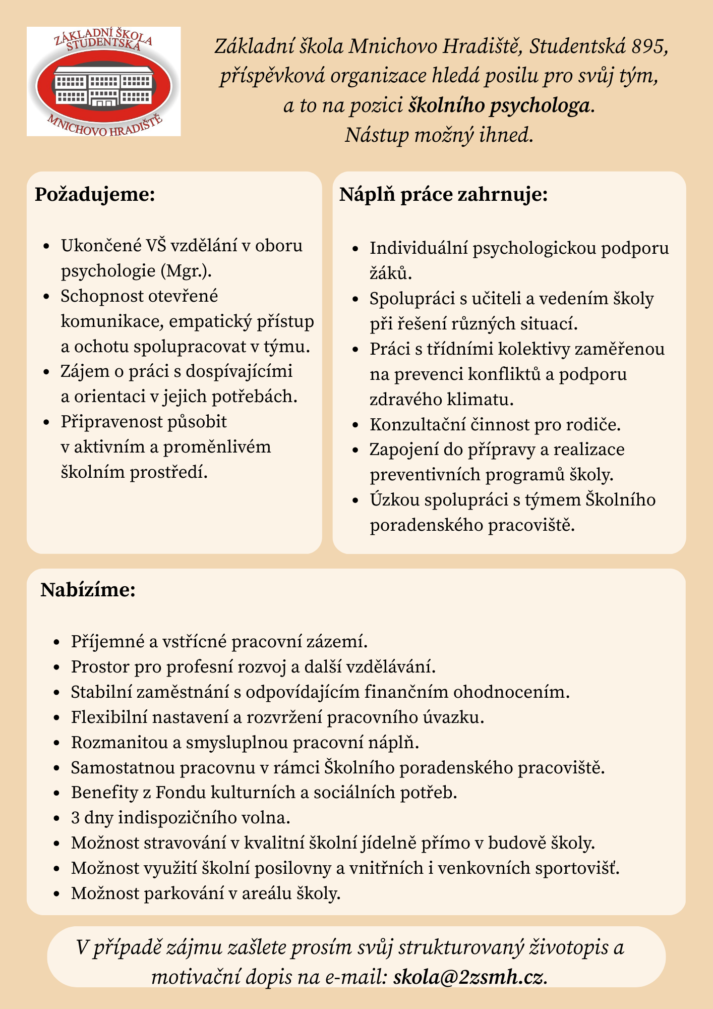 Poskytovat individuální psychologickou podporu, předcházet konfliktům, být partnerem pro učitele, studenty i rodiče. Taková práce čeká školního psychologa, kterého přijme ZŠ Studentská. Požadavkem je vysokoškolské vzdělání v oboru psychologie. Další podrobnosti na webu školy či v přiloženém letáku.