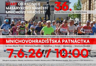 V neděli 7. června 2026 odstartuje na Masarykově náměstí 36.ročník memoriálu Ing. Josefa Hrona "Mnichovohradišťská patnáctka". Závod bude zahájen v 10 hodin, od 8 hodin mu bude předcházet prezence závodníků v přízemí radnice.